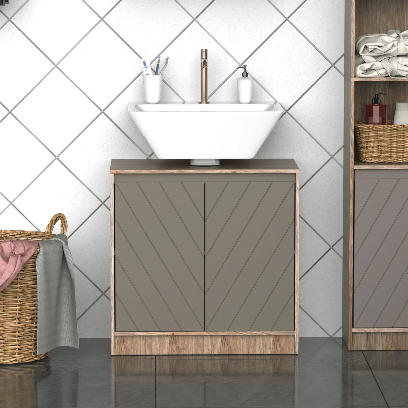 Furnishes the bathroom with a modern style together with Homcom! This sublavabo cabinet built with oak mdf color panels has a minimal and elegant design. Thanks to its essential lines and its neutral colors, it integrates perfectly with any type of furniture. The internal part is designed to hide the sink hydraulic pipes and is equipped with two height adjustable shelves. What are you waiting for, change the look of your bathroom with this locker with a minimal design!