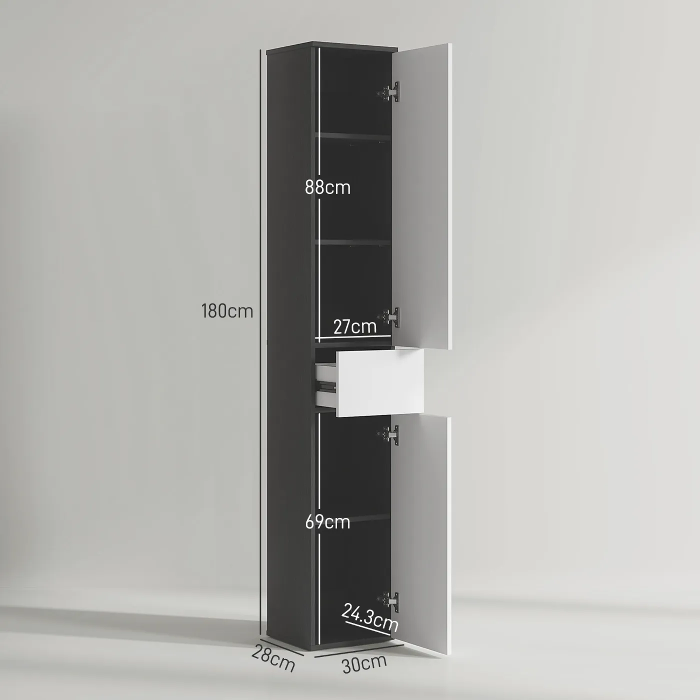 - • Internal cabinet dimensions: (top) 27W x 24.3D x 26/30/28H cm, (bottom) 27W x 24.3D x 32.7/34.6H cm