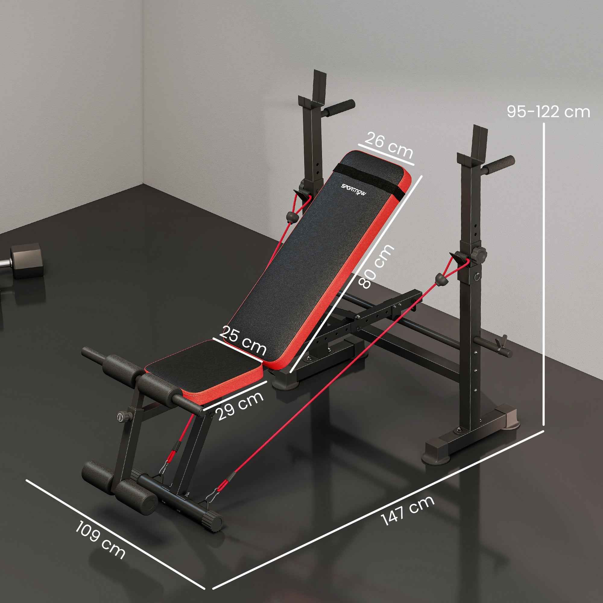 Create your own home gym with this SPORTNOW adjustable fitness bench, complete with barbell rack. The solid steel frame ensures maximum stability under heavy loads, and precise adjustments enhance comfort. With adjustable rack heights and bench incline, this weight bench is a versatile piece of equipment for all your home workouts. Features: • Combines a flat bench rack, gym bench, dip stand and resistance bands for a full-body workout • Fitness bench made with a sturdy 50mm steel frame, supports up to 420kg • Find your ideal configuration with 7 barbell rack height levels, 8-position adjustable backrest and 3-position adjustable seat • Includes 25mm weight stops and spring clamps for immediate use • Assembly required Technical data: • Color: Black • Material: Steel • Overall dimensions: 109L x 147D x 122H cm • Seat dimensions: 29L x 25D cm • Seat height: 48.5H cm • Backrest dimensions: 80L x 26D cm • Barbell rack height: 95 – 122H cm • Maximum load: 420 kg (person and weights)Package contents:• 1 x Weight bench with stand• 2 x Resistance bands• 1 x Manual