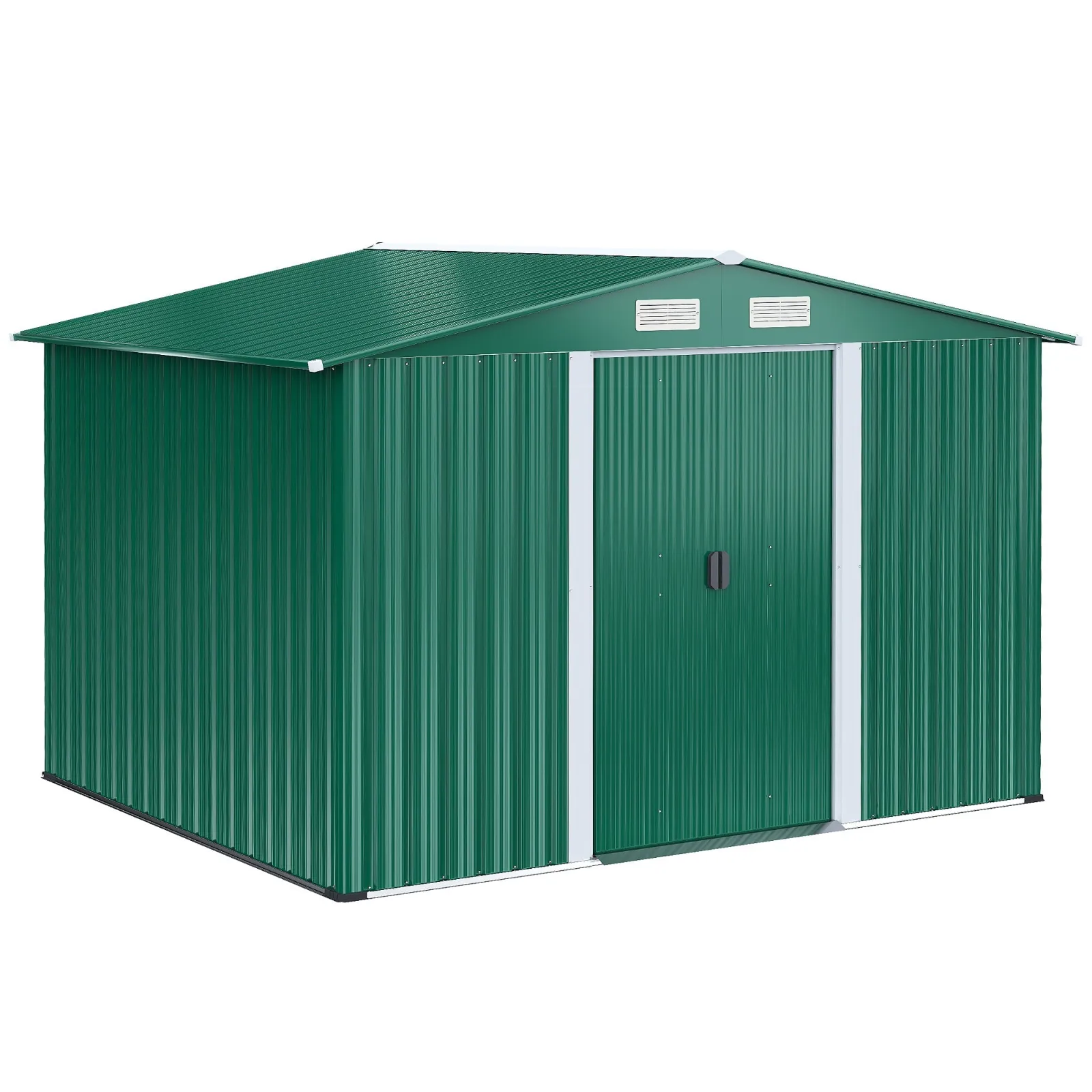 Steel Sheet Garden Tool Shed, Steel Garden Shed with Structure Base and Sliding Doors, 258x206x178cm, Green