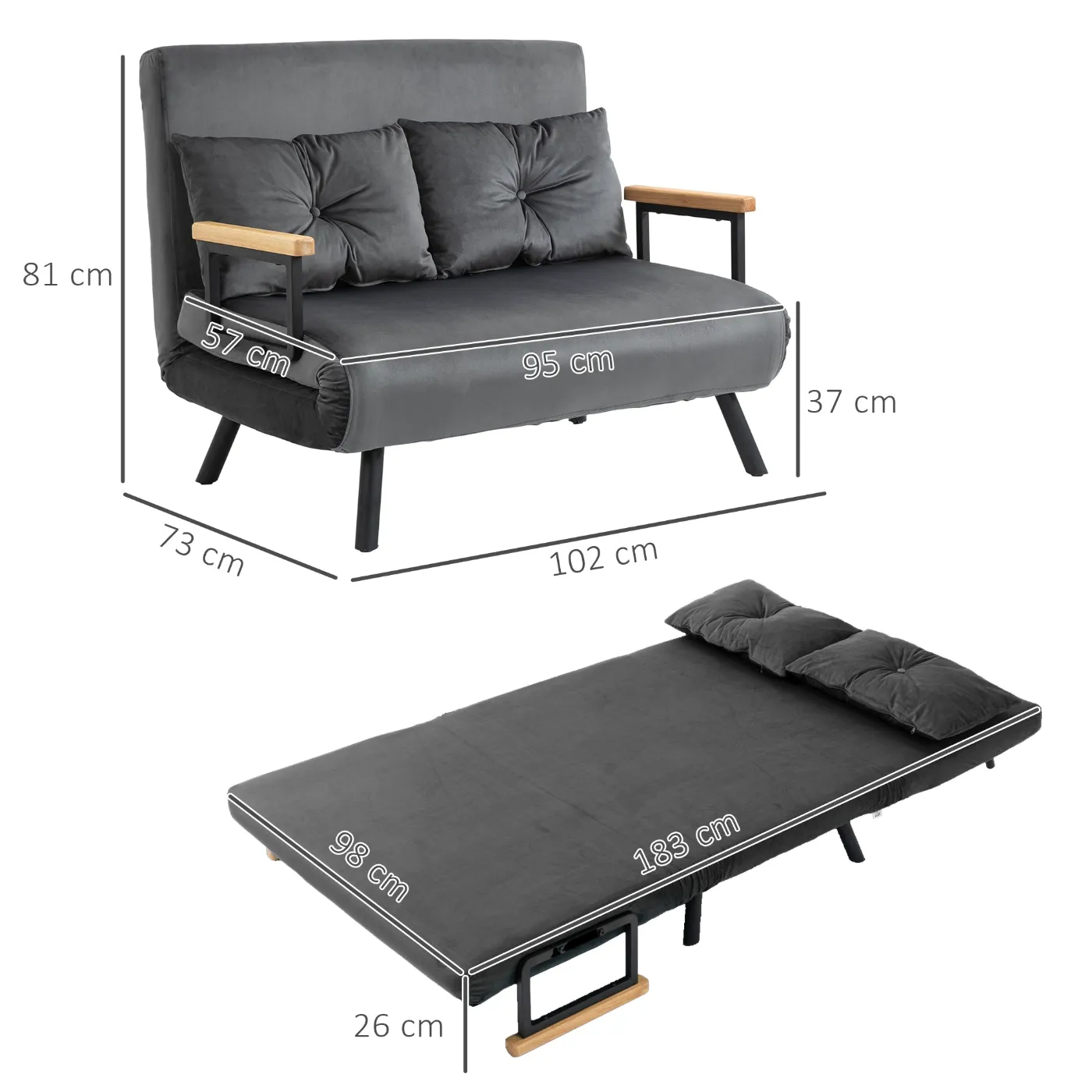 - DIMENSIONS: Sofa Dimensions: 102W x 73D x 81H cm. Bed Dimensions: 183W x 98.5D x 26H cm. Weight Capacity: 120 kg. Assembly Required