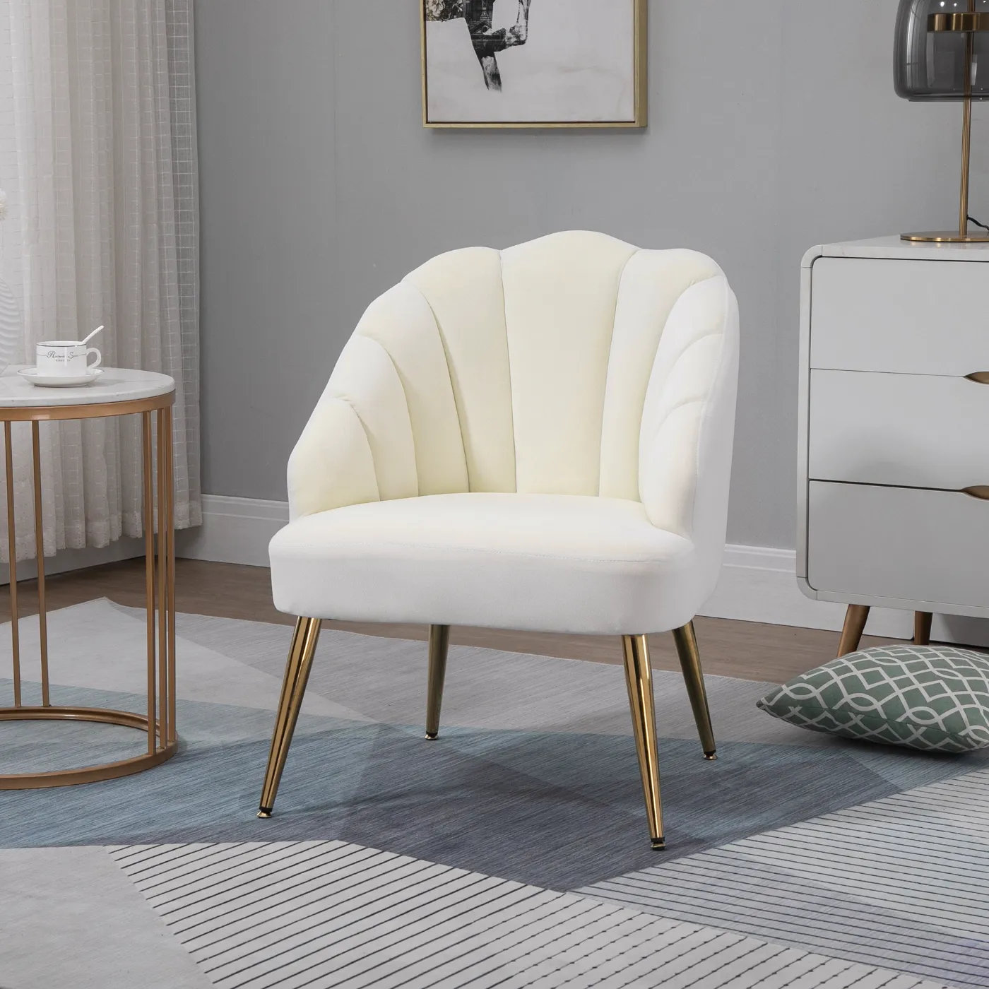 - ART DECO STYLE: The shell-shaped backrest of the bedroom armchair combined with the gold-colored legs creates a glamorous effect, to bring a touch of novelty to your spaces.