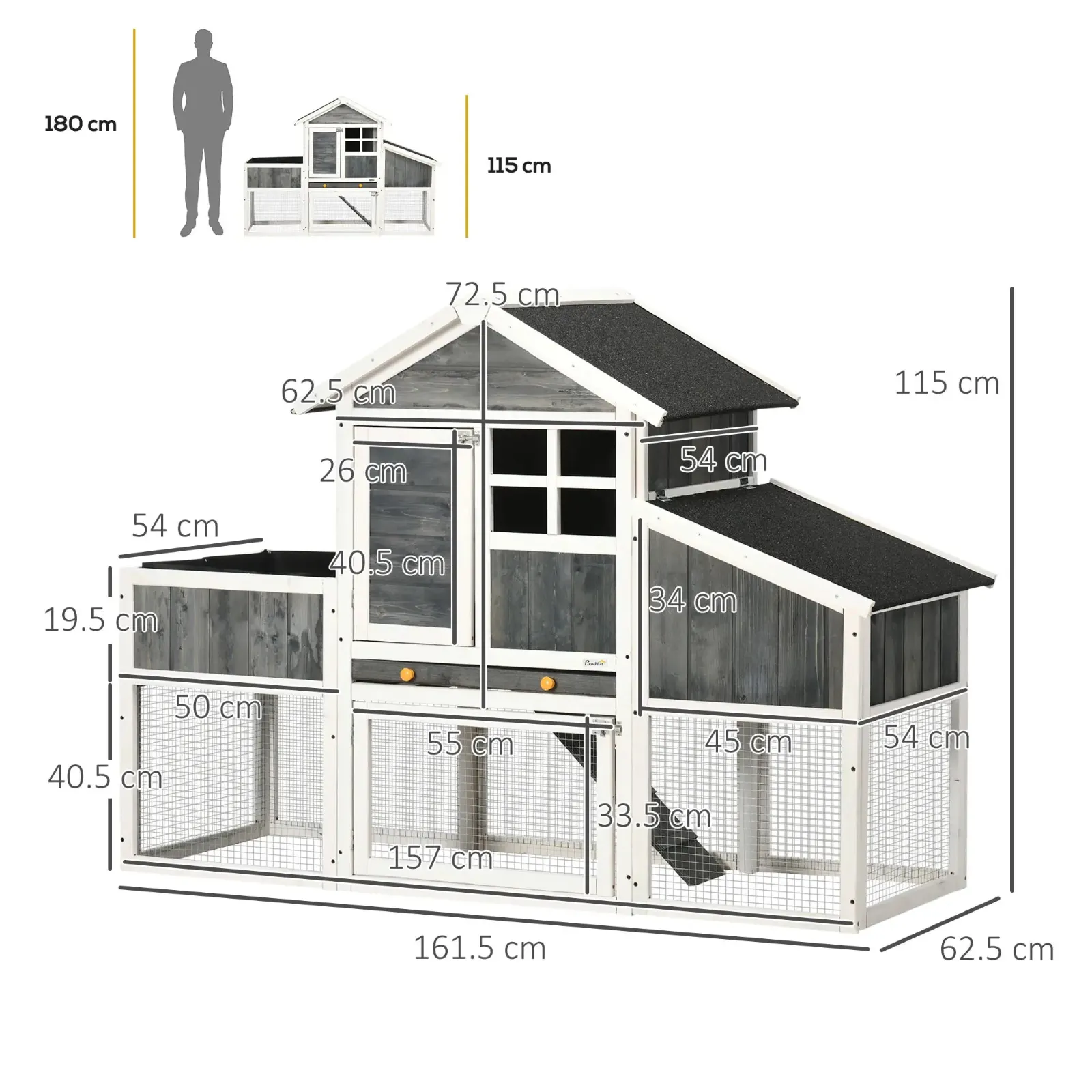 - DIMENSIONS: Overall Dimensions: 161.5W x 62.5D x 115H cm. House Dimensions: 62.5W x 54D x 72.5H cm. Assembly Required.
